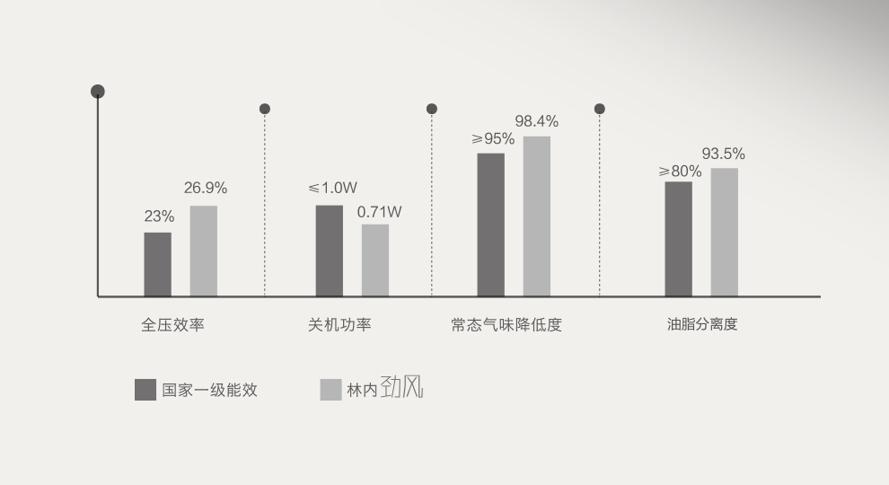 较传统烟机的贴近式吸烟风道系统,林内通过全新的风道系统上移120mm,将有效负压面积大大提升,使气流导入更加顺畅,风量达到20m³/min。